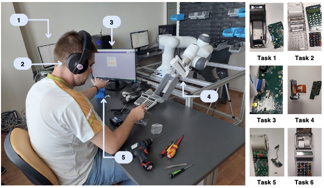 | Cobot-supported manual assembly (component delivery) | Franka Panda delivers the correct parts in sequence to reduce searching and handling errors; the worker confirms step completion via gesture. Experiments: compare cycle time, picking errors, and reach distance with/without cobot delivery; evaluate ergonomic load reduction when parts are presented in optimal pose/location. |